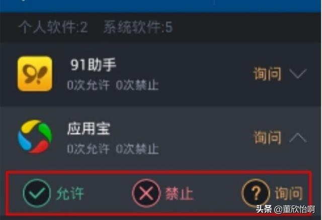 4、同样,管家清除明了的把权限分类成资费相关、隐私相关、安全相关也可以按照分类查看那些使用该权限的软件,并进行处理。如果选择允许,使用该软件此权限时管家不会再提示;选择禁止,则一次性阻止该软件使用该权限;如果选择询问,使用该软件此权限时管家会询问您是否允许。最后,在权限管理的右上角设置中,即可开启/关闭权限管理的总开关,并查看监控日志。